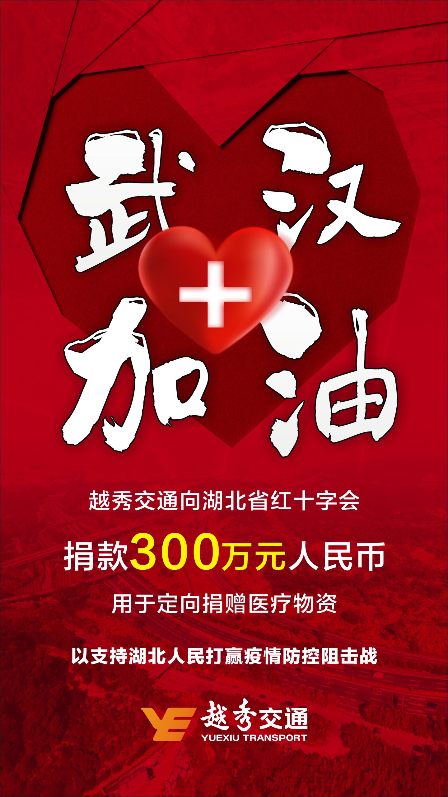 为坚决贯彻落实习近平总书记对防控新型冠状病毒感染的肺炎疫情作出的重要指示精神,积极响应党和政府有关工作精神,更好履行国有企业社会责任,越秀交通决定向湖北省红十字会捐款300万元,捐赠主体为越秀(中国)交通基建投资有限公司,受赠主体为湖北省红十字会,捐赠用途为定向捐赠医疗物资,以支持湖北人民打赢疫情防控阻击战。