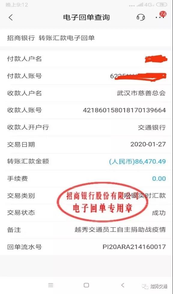 武汉冠状病毒疫情消息传到越秀交通,牵动着交通系统广大党员干部和员工群众的心。一方有难、八方支援,公司领导第一时间发出倡议、号召同事们爱心捐赠。这一倡议迅速得到响应,共有近200名员工爱心捐赠近9万元,并由汉孝公司具体办理,已捐献至武汉市慈善总会账号。