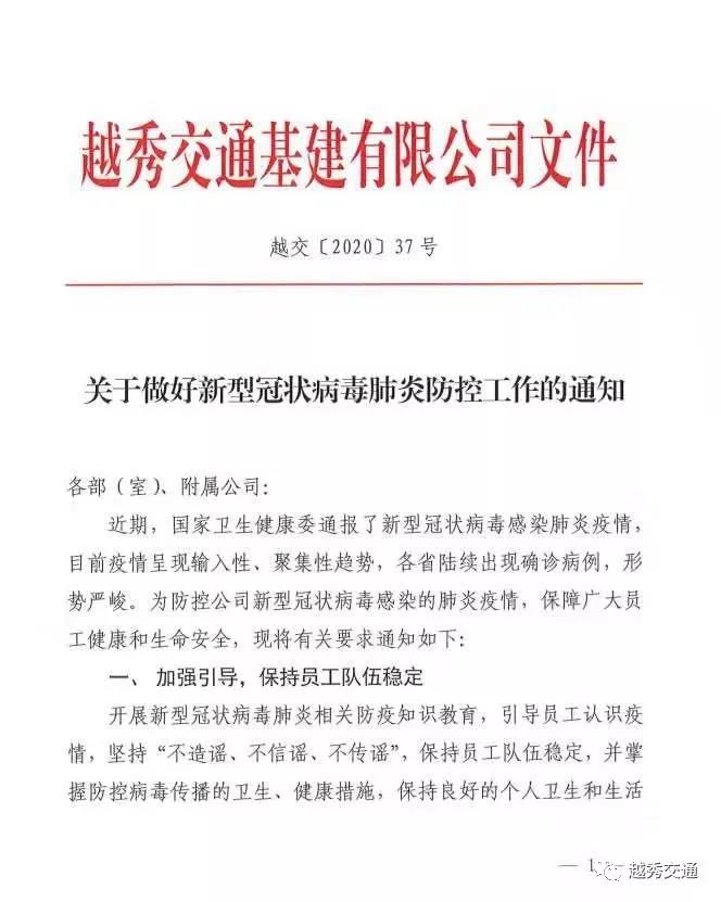 疫情就是命令,防控就是责任。为贯彻落实习近平总书记关于新型冠状病毒感染肺炎疫情的重要指示精神,越秀交通按照越秀集团对新型冠状病毒感染肺炎疫情工作的部署,有效开展疫情防控相关工作,公司全体员工众志成城、同心共济,参与到了这场对抗疫情的“战斗”中,为战胜肺炎疫情时刻努力。