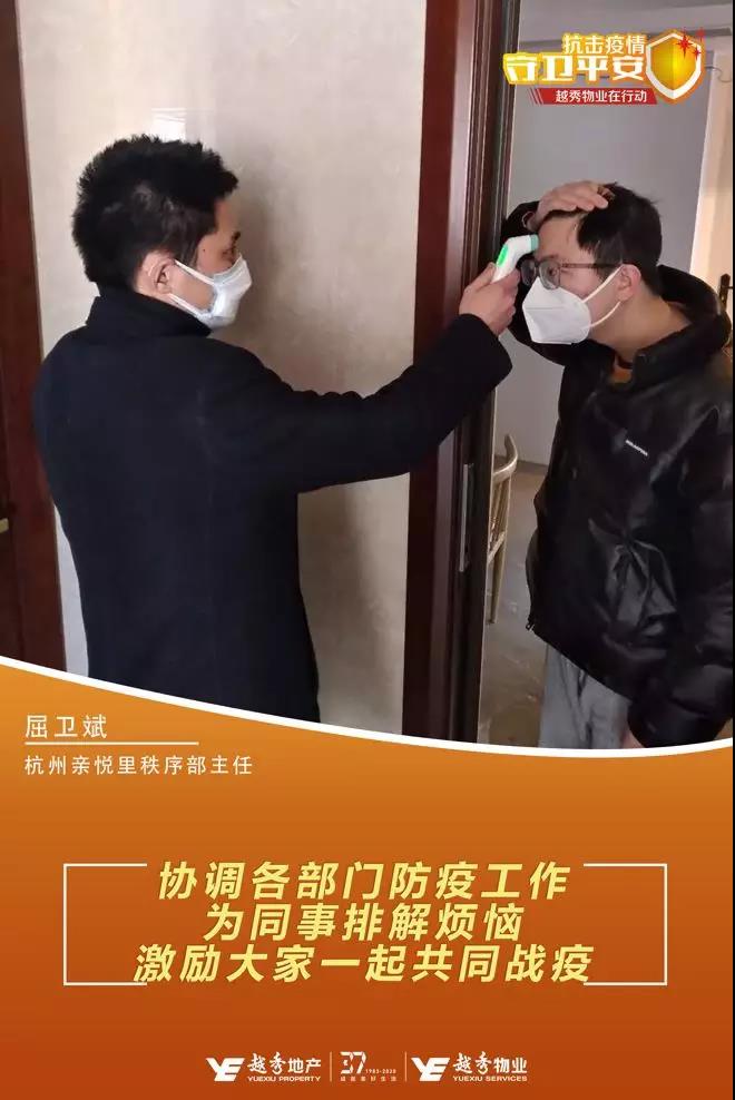 屈卫斌是杭州越秀·亲悦里物业服务中心秩序部主任,加入越秀物业才不到三个月,春节却主动选择留守岗位,与其他物业同事携手抗击疫情。每天6点天刚蒙蒙亮的时候,屈卫斌就起床开始他一天忙碌的工作。督促秩序员做好值守测温工作、与保洁主管安排园区消杀保洁;陪同管家为业主代购生活物资;协同社区人员上门排查人员信息……协助各部门处理完工作后已是中午,屈卫斌又马不停蹄,亲手为同事做午饭,让辛苦忙碌了一上午的同事都能吃上热乎的饭菜。“尽管工作很忙很累,回到服务中心还能有口热乎的饭吃,感觉像是回到了自己家一样”,区卫斌的同事感慨道。晚上下班后,区卫斌仍没有停歇,他还专门抽出时间为同事排解烦恼,激励他们一起打赢这场没有硝烟的战争。