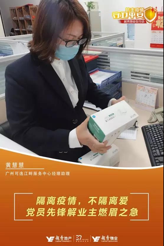 身为一名党员,黄慧慧积极投身于疫情防控阻击战中,组织保洁人员开展疫情防控专项培训,明确疫情时期的消杀保洁要求;配合社区、政府开展排查工作,做好重点人员情况摸查。在摸查过程中,黄慧慧了解到,有户业主刚从武汉返穗居家隔离,业主年迈的母亲有20年糖尿病病史,且长期服药,隔离期间用药告急,只剩不到三天药量。黄慧慧立即与各方沟通协商,拉起了一个有业主、居委会、医生的微信群,共同商讨对策,最终将药品及时送到业主手中,解了燃眉之急。