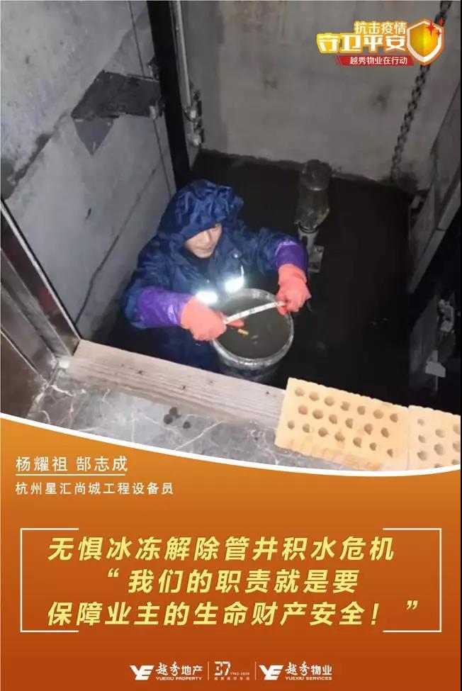 2月初的某天,杭州下起了毛毛细雨,天气阴冷潮湿,杭州越秀·星汇尚城某楼栋因业主家管道爆裂导致电梯管井积水,物业服务中心得知情况后,第一时间赶到了现场。因事项紧急,工程组两位小伙杨耀祖、郜志成毅然跳入冰寒彻骨的积水,一桶一桶地将水提出,和客服、秩序组的小伙伴们一起接力,在最短的时间内将井底积水清除干净,使电梯及时恢复运行,有效避免了安全事故的发生。