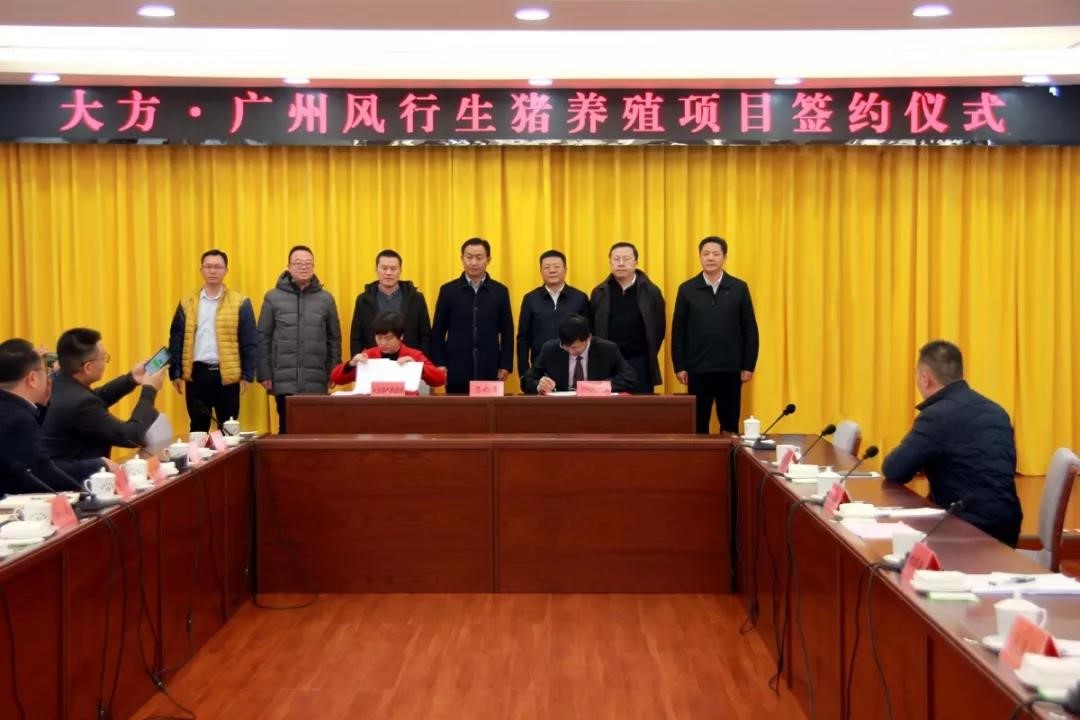 广州越秀集团副总经理、风行集团总经理林辉新与大方县县长陈萍进行生猪养殖一体化项目签约