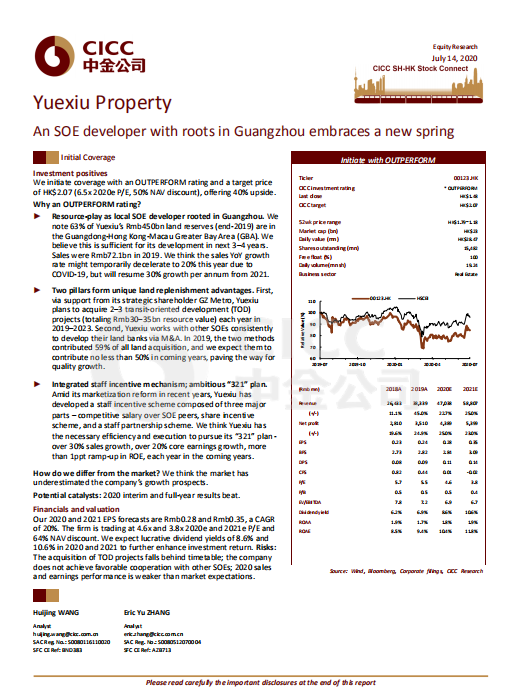 7月14日,著名投行中金公司首次覆盖越秀地产股份有限公司(股份代号:00123.HK),给予“跑赢行业”评级,设定目标价为2.07港元,对应6.5倍2020市盈率和50%的NAV折让,较当前股价有40%的上行空间。此评级是中金公司对越秀地产大湾区布局、独特的增储方式、稳健的资金支持及员工激励机制的认可。